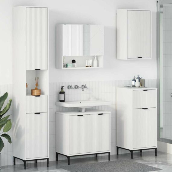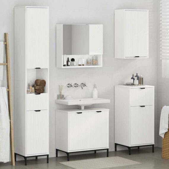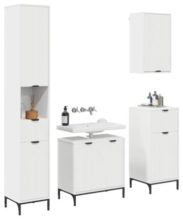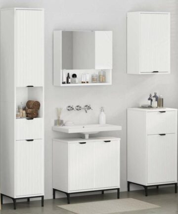 Dieses schicke Badezimmermöbelset aus Holzwerkstoff verbessert jeden Badezimmerbereich mit modernem Design und hoher Funktionalität. Es richtet sich an alle, die einen klaren Stil und praktische Stauraumlösungen suchen, und bietet die perfekte Mischung aus schicker Einfachheit und Anpassungsfähigkeit in verschiedenen Räumen. Mit seinem minimalistischen Look und den flexiblen Stauraummöglichkeiten ist es die perfekte Lösung für Bäder jeder Größe, die sich mühelos in verschiedene Innendekorationen einfügt. Materialien: Sorgfältig aus Holzwerkstoff gefertigt, bietet das Set Stabilität und Stil und hat ein modernes Design. Holzwerkstoff ist wegen seiner gleichmäßigen Oberfläche, Widerstand gegen Feuchtigkeit und Langlebigkeit beliebt und sorgt für ein schickes Aussehen, das das gesamte Badezimmer aufwertet und die Pflege erleichtert. Inklusive Komponenten: Das Set bietet viele Stauraumlösungen mit einem wandmontierten Waschtischschrank, einem Badschrank, einem Badwand-Schrank und einem Hochschrank. Jede Komponente ermöglicht einfachen Zugang, verbessert die Organisation und Nutzung des Raums im Badezimmer. Eigenschaften / Funktion / Design: Entworfen für modernes Design, bieten die flächenbündigen Türen mit glatten Oberflächen und Stangengriffen ein elegantes, nahtloses Erscheinungsbild. Jedes Stück verleiht dem Badezimmer ein sauberes, abgestimmtes Look und sorgt für Ordnung. Empfohlene Anwendungen: Ideal, um das Badezimmer effizient zu gestalten, unterstützt dieses Set verschiedene Stauraumbedürfnisse mit praktischen Trennmöglichkeiten und ist perfekt für kleine Wohnungen, Haushalte oder Gästebäder. Sein schlankes Design passt perfekt in jede moderne Einrichtung. Pflege & Wartung: Die Pflege ist einfach. Um das saubere und frische Aussehen zu erhalten, wische regelmäßig mit einem feuchten Tuch über die Oberflächen. Dank des Holzwerkstoffs ist die Pflege unkompliziert und sorgt für Langlebigkeit.