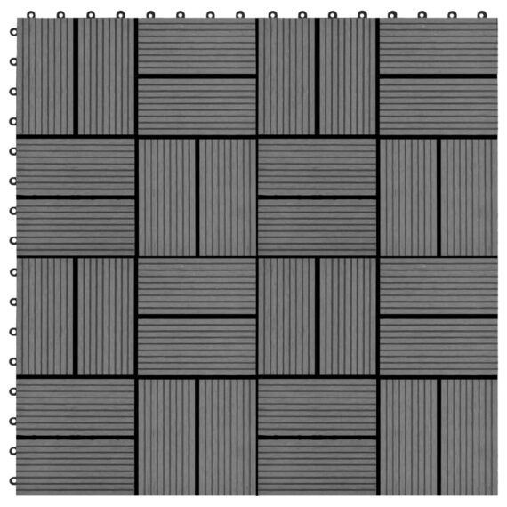 Dieses Dielenset aus WPC besteht aus 11 Dielen mit einer individuellen Fliesengröße von 30 x 30 cm und bedeckt eine Gesamtfläche von 1 Quadratmeter. Es ist perfekt für Terrassen, Balkone, Badezimmer oder Ihren Pool oder Wellnessbereich. Dank Klicksystem lassen sich diese qualitativ hochwertigen Dielen aus WPC ganz schnell und einfach verbinden und verlegen, ohne dass Werkzeuge dafür erforderlich sind. Aus Holz-Kunststoff-Verbund hoher Qualität gefertigt, sind unsere Fliesen sowohl wasserbeständig als auch langlebig.