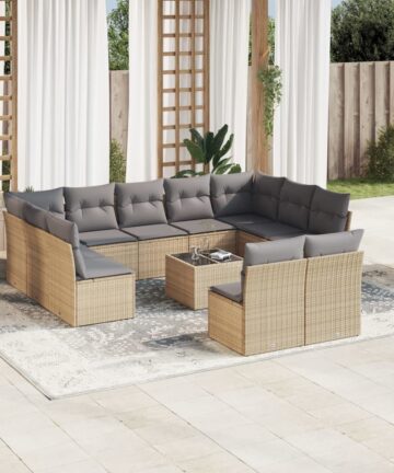 Diese Garten-Sofagarnitur ist die perfekte Ergänzung zu deinem Garten, deiner Terrasse oder deinem Innenhof. Sie bietet einen bequemen und einladenden Platz, um mit Familie und Freunden zu plaudern oder dich einfach nur zu entspannen und das Leben im Freien zu genießen. Langlebiges Material: PE-Rattan, auch als Poly Rattan bekannt, ist ein robustes, pflegeleichtes synthetisches Material, das die Optik von natürlichem Rattan aufweist. Es kennzeichnet sich durch ein geringes Eigengewicht und lässt sich einfach reinigen. Aufgrund seiner Haltbarkeit und Witterungsbeständigkeit wird es häufig bei der Herstellung von Gartenmöbeln verwendet.Stauraum mit wasserfestem Beutel: Jedes Gartensofa verfügt über ein Staufach unter der Sitzfläche, das mit einem wasserfesten Beutel zur Aufbewahrung von Kissen, Spielzeug und anderen Gegenständen versehen ist. Die Kissen sind mit Bezügen versehen und lassen sich mit Klettverschlüssen fest und sicher an den Sofas befestigen.Tischplatte aus Glas: Die Tischplatte des Gartentisches besteht aus starkem und langlebigem Hartglas, sodass sie leicht mit einem feuchten Tuch gereinigt werden kann und deinem Außenbereich einen Hauch von Eleganz verleiht.Abnehmbarer und waschbarer Bezug: Diese Sitzkissen verfügen über abnehmbare Bezüge für einfaches Waschen und Pflegen.Modulares Design: Dank des modularen Designs lassen sich die Gartenmöbel völlig flexibel und einfach umstellen, um deinen Außenbereich ganz individuell zu gestalten. Gut zu wissen:Wir empfehlen dir, deine Gartenmöbel mit einer wasserdichten Hülle zu schützen, um lange Zeit eine ansprechende Optik aufzuweisen.