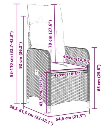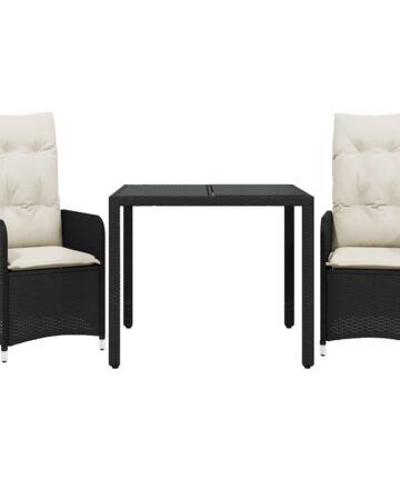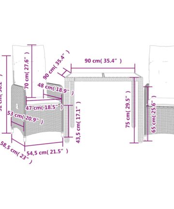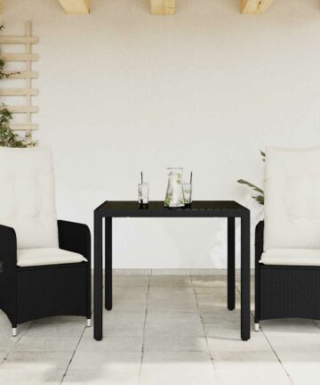 Genieße einen Kaffee oder unterhalte dich mit deiner Familie und deinen Freunden im Garten, Hinterhof oder auf dem Balkon mit diesem bequemen Bistro-Set! Langlebiges Material: PE-Rattan, auch als Poly Rattan bekannt, ist ein robustes, pflegeleichtes synthetisches Material, das die Optik von natürlichem Rattan aufweist. Es kennzeichnet sich durch ein geringes Eigengewicht und lässt sich einfach reinigen. Aufgrund seiner Haltbarkeit und Witterungsbeständigkeit wird es häufig bei der Herstellung von Gartenmöbeln verwendet.Verstellbare Rückenlehne: Der Gartensessel ist mit einem Griff versehen. So kannst du die Rückenlehne durch Ziehen des Griffs verstellen und sie danach schnell wieder in ihre ursprüngliche Position bringen.Bequemes Sitzerlebnis: Dieser Gartensessel mit dick gepolsterten Kissen bietet ein angenehmes Sitzgefühl.Abnehmbarer und waschbarer Bezug: Die Sitzkissen verfügen über abnehmbare Bezüge, die sich ganz einfach waschen und reinigen lassen. Dank der Klappen an der Rückseite können die Rückenkissen ganz einfach an den Rückenlehnen befestigt werden.Tischplatte aus Glas: Die Tischplatte des Gartentisches besteht aus starkem und langlebigem Hartglas, sodass sie leicht mit einem feuchten Tuch gereinigt werden kann und deinem Außenbereich einen Hauch von Eleganz verleiht. Gut zu wissen:Wir empfehlen dir, deine Gartenmöbel mit einer wasserdichten Hülle zu schützen, um lange Zeit eine ansprechende Optik aufzuweisen.