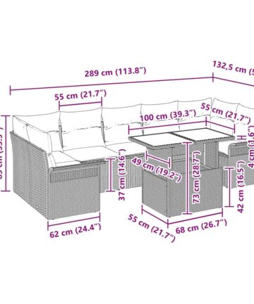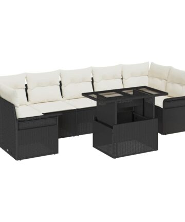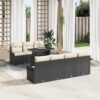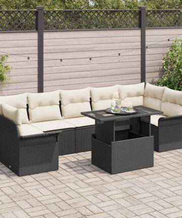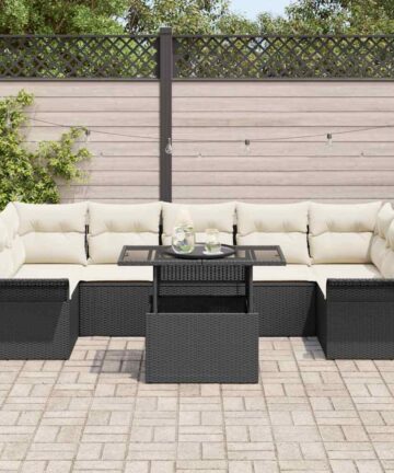 Dieses 8-teilige Garten-Sofa-Set mit Kissen ist eine stylische Lösung für Entspannung und Essen im Freien. Es ist perfekt für deine Terrasse oder deinen Balkon. Mit seinem modernen Design und der ansprechenden Zweifarbkombination bietet es sowohl Komfort als auch Funktionalität und schafft einen großartigen Ort für Freunde und Familie, um im Frühling oder Sommer abzuhängen. Platzangebot: Dieses Set hat Platz für bis zu 7 Personen – perfekt für Familienfeiern oder um Freunde im Freien zu unterhalten. Materialzusammensetzung: Hergestellt aus hochwertigem Poly-Rattan mit wasserabweisenden und UV-beständigen Kissen, bietet dieses Möbelset Langlebigkeit und ist widerstandsfähig gegen Witterung. Vielseitiges Design: Das modulare Layout ermöglicht es dir, es an deinen Außenbereich anzupassen und für verschiedene Anlässe neu anzuordnen. Einfache Pflege: Die abnehmbaren Kissenbezüge mit Reißverschluss lassen sich mühelos waschen, sodass du dein Sofa immer in top Form halten kannst. Stylisch & Funktional: Das schlichte schwarze Finish und die beigen Kissen passen zu verschiedenen Einrichtungsstilen und bringen das Beste aus deinem Garten oder deiner Terrasse heraus.