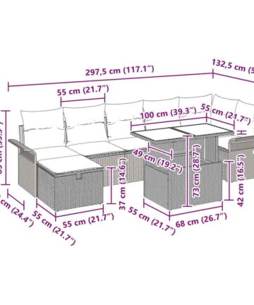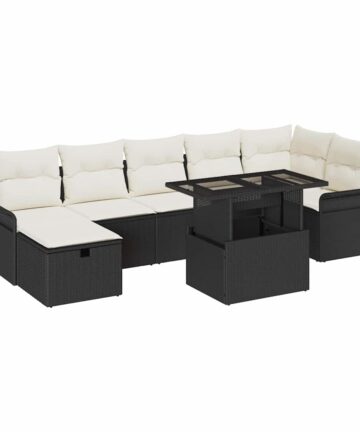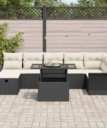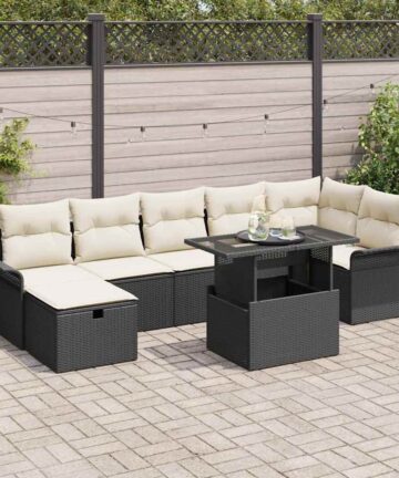 Dieses Garten-Sofa-Set, mit acht gut gemachten Teilen, verwandelt Außenbereiche stilvoll und praktisch. Die Kombination aus Poly-Rattan und weichen Kissen in Creme und Dunkelbraun schafft eine gemütliche Atmosphäre, die perfekt ist, um zu entspannen oder Freunde und Familie auf deinem Balkon oder deiner Terrasse zu empfangen. Stauraum-Funktion: Die Stauraumfächer unter den Sitzen sind eine praktische Möglichkeit, Kissen und Decken versteckt, aber griffbereit zu halten. Vielseitiges Design: Die modulare Anordnung lässt dich die Sitzplätze so arrangieren, dass sie zu deinem Raum und Stil passen und dir die Möglichkeit geben, die ideale Lounge- oder Essumgebung für enge Treffen oder große Feiern zu schaffen. Komfort: Mit dicken, weichen Kissen aus Polyester garantiert dieses Sofa-Set, dass du bei langen Sommer-Hangouts angenehm sitzt, und bietet gemütliche Unterstützung, während du deinen Außenbereich genießt. Haltbarkeit: Hergestellt aus UV-beständigen Materialien, bleibt dieses Set schön und bequem, selbst wenn die Sonne scheint, sodass es über Jahre hinweg in deiner Außendekoration bleibt. Pflegeleicht: Die abnehmbaren Kissenbezüge mit Reißverschluss machen die Reinigung blitzschnell, und ein schnelles Abwischen der Poly-Rattan-Oberfläche mit einem feuchten Tuch reicht, um das Aussehen frisch zu halten und dir ein stressfreies Outdoor-Erlebnis zu ermöglichen.