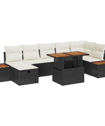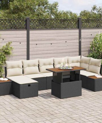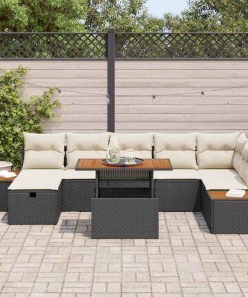 Dieses achtteilige Garten Sofa Set verbindet Stil mit Funktionalität. Ideal für gesellige Runden oder für einen entspannten Abend im Freien. Das schwarze Rattan mit cremefarbenen Kissen schafft eine einladende Atmosphäre, die sich gut in jede Garten- oder Balkon-Dekoration einfügt. Das modulare Design erlaubt es dir, es anzupassen und deinen Platz optimal zu nutzen. Geräumige Sitzgelegenheit: Platz für bis zu 4 Personen, ideal für kleine Zusammenkünfte oder Familienmomente. Integrierter Stauraum: Jedes Stück hat praktischen Stauraum, um Kissen und Outdoor-Zubehör ordentlich wegzupacken, wenn sie nicht gebraucht werden. Haltbar und wetterbeständig: Aus hochwertigen Materialien gemacht, die unterschiedlichen Wetterbedingungen standhalten, damit deine Gartenmöbel lange Freude bringen. Moderne Ästhetik: Die klaren Linien des Sofas verleihen deinem Außenbereich einen modernen Touch und passen gut zu vielen Einrichtungsstilen. Bequeme Kissen: Dicke, weiche Kissen mit wasserfestem Bezug bieten Komfort und sind einfach zu pflegen, perfekt für den täglichen Gebrauch.