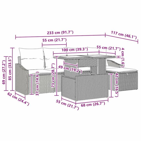 Dieses moderne Outdoor-Sitzset kombiniert schickes Design mit praktischen Funktionen und verleiht jedem Garten oder jeder Terrasse einen eleganten Touch. Es ist perfekt für entspannte Stunden im Freien, mit trendy gewobenem Poly-Rattan und bequemen Polyesterkissen, und bietet dir einen tollen Platz zum Relaxen in der Sonne. Modulares Design: Das Sitzset ist modular, sodass du die Anordnung ganz nach Lust und Laune ändern kannst. Egal, ob du eine große Feier veranstaltest oder einen entspannten Tag genießt, es lässt sich leicht umstellen. Es kommt mit zwei Mittelplätzen, zwei Armsofas, einem Fußhocker und einem Gartentisch, alles mit praktischem Stauraum. Robuste Materialien: Hergestellt aus starkem Poly-Rattan, hält es UV-Strahlen und Regen stand. Dieses Material sorgt dafür, dass deine Möbel bei jedem Wetter toll aussehen und perfekt in das moderne Gestaltungskonzept eines jeden Außenbereichs passen. Funktionales Design: Jedes Stück hat verstellbare Füße, damit es auch auf unebenem Gelände stabil bleibt. Der Gartentisch hat eine Sicherheitsglasplatte, die nicht nur schick aussieht, sondern auch die Reinigung erleichtert. Stauraumlösungen: Jeder Sitz hat Fächer darunter für zusätzlichen Stauraum. Ideal zum Verstauen von Outdoor-Utensilien wie Decken oder Büchern, alles bleibt ordentlich und griffbereit. Einfache Pflege: Die Kissen haben abnehmbare Bezüge, was die Reinigung super einfach macht. Einfach regelmäßig mit einem feuchten Tuch abwischen und die Möbel abdecken, wenn du sie nicht nutzt, um ihre Lebensdauer zu verlängern.