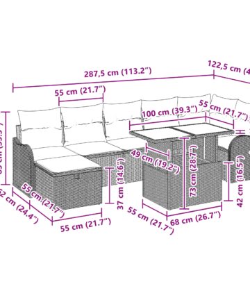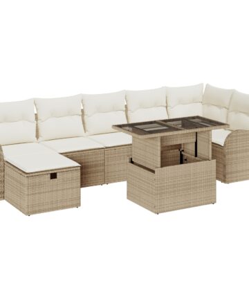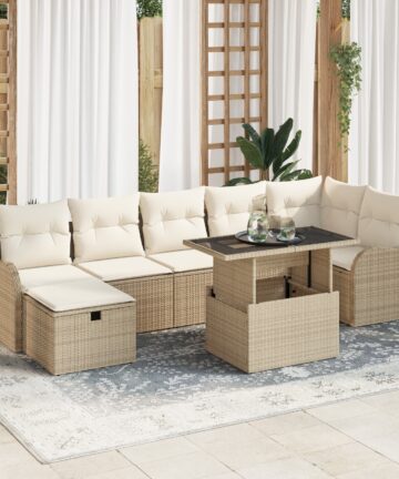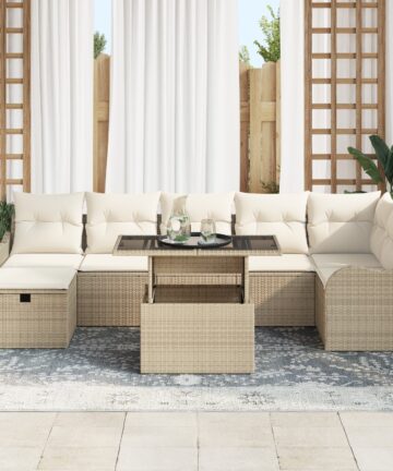 Dieses 8-teilige Garten-Sofa-Set mit Kissen in Beige kombiniert Stil und Funktion, perfekt für entspannte Stunden im Freien. Das modulare Design lässt dich mixen und anpassen, um deinen Garten, Patio oder Balkon nach deinen Wünschen zu gestalten. Modulares Design: Das modulare Design des Sofa-Sets ermöglicht es dir, verschiedene Layouts für jeden Raum zu planen – perfekt für Treffen oder um einfach mal zu entspannen. Wetterbeständige Konstruktion: Hergestellt aus langlebigem Rattan, bietet dieses Set eine dauerhafte Nutzung im Freien. Die Kissen sind mit wasserfestem Stoff bezogen, was die Kombination aus Stil und Praktikabilität perfekt macht. Verstellbare Füße: Mit verstellbaren Füßen kannst du die Höhe jedes Teils anpassen, um auf unebenen Oberflächen Stabilität zu gewährleisten. Das sorgt für extra Komfort. Abnehmbare Kissen: Die Kissen haben einen Reißverschluss, der sie einfach abnehmbar macht – ideal für Reinigung oder Austausch. So kannst du frische Sitzgelegenheiten genießen und für einen neuen Look sorgen. Stylisches Design: Das strukturierte beige Rattan sieht ganz hervorragend in deinem Außenbereich aus. Die cremigen Kissen setzen einen modern trendigen Akzent, der einladend wirkt.