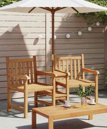 Gartenstühle kombinieren rustikales Design mit haltbaren Materialien, die perfekt in jeden Garten oder auf jede Terrasse passen. Hergestellt aus solidem Teakholz, überzeugen sie durch ihr schönes, rustikales Aussehen und sind eine einladende Ergänzung für jeden Außenbereich. Ob du entspannst oder Freunde einlädst, die natürliche Schönheit des Holzes unterstreicht ihr schickes Design. Robustes Teakholz: Diese Stühle sind aus solidem Teakholz gefertigt, was sie stark und wetterfest macht. Teakholz eignet sich super für den Außenbereich, sodass du sicher sein kannst, dass sie lange halten. Außerdem gibt dir die natürliche Widerstandsfähigkeit des Holzes gegen Feuchtigkeit und Schädlinge ein gutes Gefühl, egal bei welchem Wetter. Geschnitzte Armlehnen: Die geschnitzten Armlehnen sehen nicht nur klasse aus, sondern bieten auch gemütlichen Halt, was lange Sitzungen viel angenehmer macht. Ihr elegantes Design sorgt für Komfort und zeigt das Handwerk in ihrem rustikalen Charme. Stabile Beine: Mit stabilen, zylindrischen Beinen stehen diese Stühle auf allen Oberflächen fest. Egal, ob sie auf Terrassen oder Gras stehen, sie verteilen das Gewicht gut, sodass du nicht wackeln musst. Sie sind eine zuverlässige Wahl für jedes Outdoor-Event. Praktisches Regal: Das eingebaute Teakregal bietet nützlichen Stauraum für all deine Gartenutensilien. Egal, ob du einen Platz für dein Getränk, dein Buch oder deine Werkzeuge brauchst, das Regal macht alles einfacher und hält deinen Außenbereich ordentlich. Einfache Pflege: Die Pflege dieser Stühle ist kinderleicht. Eine Abdeckung über die Stühle, wenn du sie nicht benutzt, schützt das Holz vor Witterungseinflüssen. Mit diesem einfachen Tipp kannst du ihren rustikalen Charme über Jahre genießen, ohne viel Aufwand.