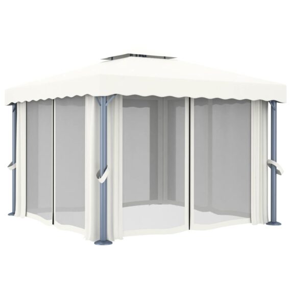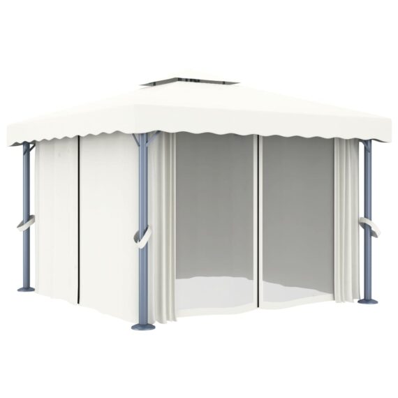 Dieser stilvolle Pavillon wird Ihren Garten sicher zu einem eleganten und funktionellen Treffpunkt machen! Er wurde entworfen, um einen kühlen Ort zu schaffen, an dem man im Freien feiern, mit der Familie picknicken, im Garten grillen und andere gesellschaftliche Zusammenkünfte veranstalten kann. Er besteht aus einem Aluminiumgestell und pulverbeschichteten Stahlrohren, welche eine hohe Stabilität und Langlebigkeit gewährleisten. Das Dach und die Seitenwände sind aus hochwertigem Polyestergewebe mit PA-Beschichtung gefertigt, das Sie vor schädlichen Sonnenstrahlen und mildem Regen schützt. Das ausgeklügelte 2-stöckige Dach sorgt für einen ausreichenden Luftstrom im Inneren. Zusätzlich sind Vorhänge und Moskitonetze zum vollständigen Schutz enthalten, die Ihnen zusätzliche Privatsphäre bieten und gleichzeitig lästige Mücken und andere Insekten fern halten. Zur einfachen Befestigung sind Haken und Befestigungsschlaufen im Lieferumfang enthalten. Der Pavillon ist einfach zu montieren. Hinweis: Dieser Artikel sollte NIEMALS bei rauen Wetterbedingungen, wie starkem Wind, Regenschauer, starkem Schneefall, Sturm, Hagel, usw., genutzt werden.