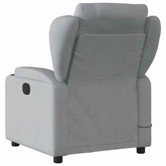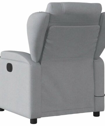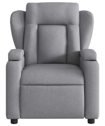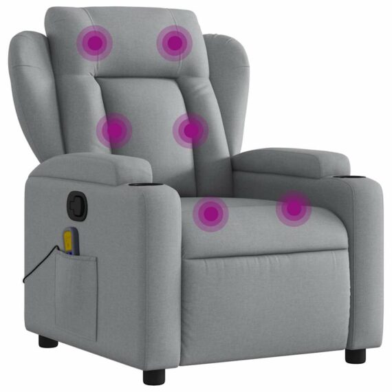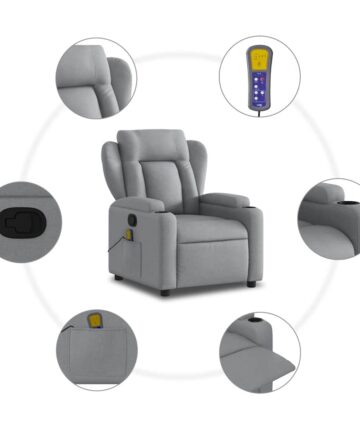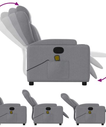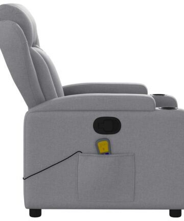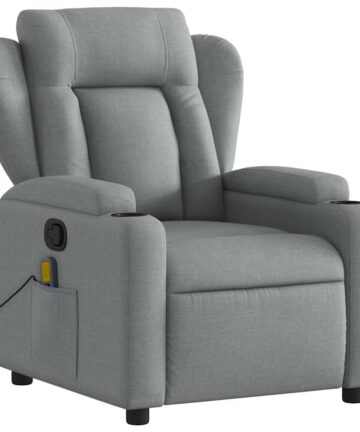 Lehnen Sie sich zurück und entspannen Sie sich in diesem äußerst bequemen Massagesessel! Manuelle Liegefunktion: Dieser Liegesessel verfügt über einen Griff auf der rechten Seite. Sie können die Fußstütze und die Rückenlehne durch einfaches Ziehen am Griff manuell in jede für Sie bequeme Position bringen. Diese Funktion ermöglicht eine maximale Neigung von 135 Grad. Zusätzlich lässt sich die Rückenlehne durch einfaches Ziehen am Griff schnell in die Ausgangsposition zurückstellen. Vibrationsfunktion: Die 6 Massagepunkte ermöglichen eine gezieltere Massage. Mit der mitgelieferten Handsteuerung können Sie verschiedene Massageprogramme auswählen. Die Massagefunktion wird über den USB-Anschluss mit Strom versorgt, ein zertifiziertes 5-V-USB-Netzteil ist jedoch nicht im Lieferumfang enthalten. Bequemes Sitzerlebnis: Die dick gepolsterte Sitzfläche, Rückenlehne und die breiten, mit Stoff bezogenen Armlehnen sorgen für ein behagliches und warmes Gefühl, während Sie sitzen. Der Stoff besticht durch eine schlichte und klare Optik und ist atmungsaktiv und strapazierfähig.Praktische Getränkehalter und Seitentasche: Dieser Sessel verfügt über zwei praktische Getränkehalter für Ihre Getränke und eine Seitentasche für Ihre Fernbedienung oder um Ihre wichtigen Gegenstände griffbereit aufzubewahren.Solider und stabiler Rahmen: Der Rahmen aus Holz und Metall sorgt für eine starke Struktur und Stabilität. Dieser Liegesessel ist bequem und langlebig.