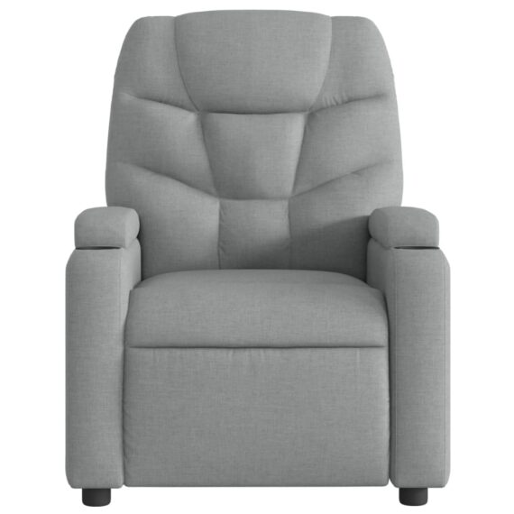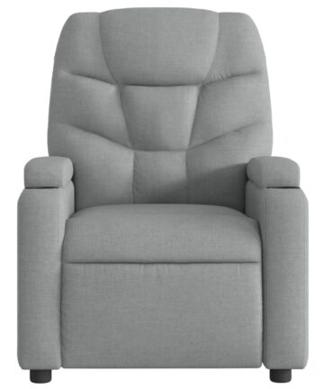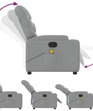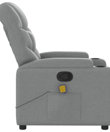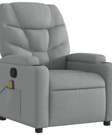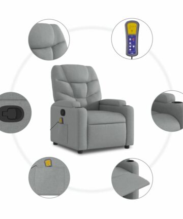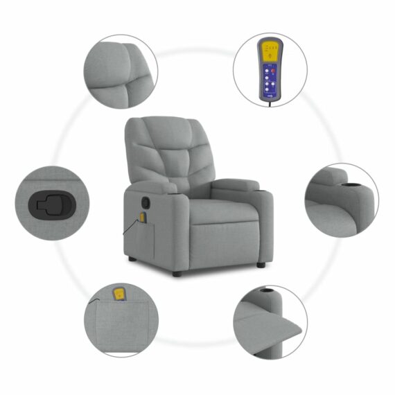 Lehnen Sie sich zurück und entspannen Sie sich in diesem äußerst bequemen Massagesessel! Manuelle Liegefunktion: Dieser Liegesessel verfügt über einen Griff auf der rechten Seite. Sie können die Fußstütze und die Rückenlehne durch einfaches Ziehen am Griff manuell in jede für Sie bequeme Position bringen. Diese Funktion ermöglicht eine maximale Neigung von 135 Grad. Zusätzlich lässt sich die Rückenlehne durch einfaches Ziehen am Griff schnell in die Ausgangsposition zurückstellen. Vibrationsfunktion: Die 6 Massagepunkte ermöglichen eine gezieltere Massage. Mit der mitgelieferten Handsteuerung können Sie verschiedene Massageprogramme auswählen. Die Massagefunktion wird über den USB-Anschluss mit Strom versorgt, ein zertifiziertes 5-V-USB-Netzteil ist jedoch nicht im Lieferumfang enthalten. Bequemes Sitzerlebnis: Die dick gepolsterte Sitzfläche, Rückenlehne und die breiten, mit Stoff bezogenen Armlehnen sorgen für ein behagliches und warmes Gefühl, während Sie sitzen. Der Stoff besticht durch eine schlichte und klare Optik und ist atmungsaktiv und strapazierfähig.Praktische Getränkehalter und Seitentasche: Dieser Sessel verfügt über zwei praktische Getränkehalter für Ihre Getränke und eine Seitentasche für Ihre Fernbedienung oder um Ihre wichtigen Gegenstände griffbereit aufzubewahren.Solider und stabiler Rahmen: Der Rahmen aus Holz und Metall sorgt für eine starke Struktur und Stabilität. Dieser Liegesessel ist bequem und langlebig.