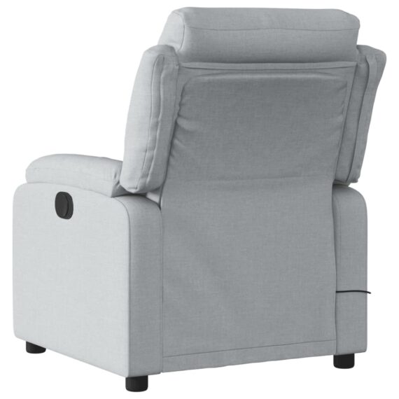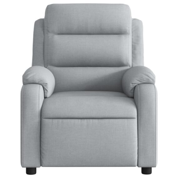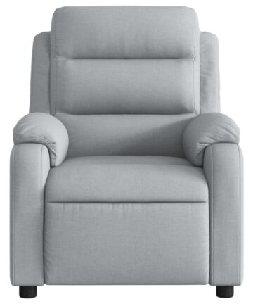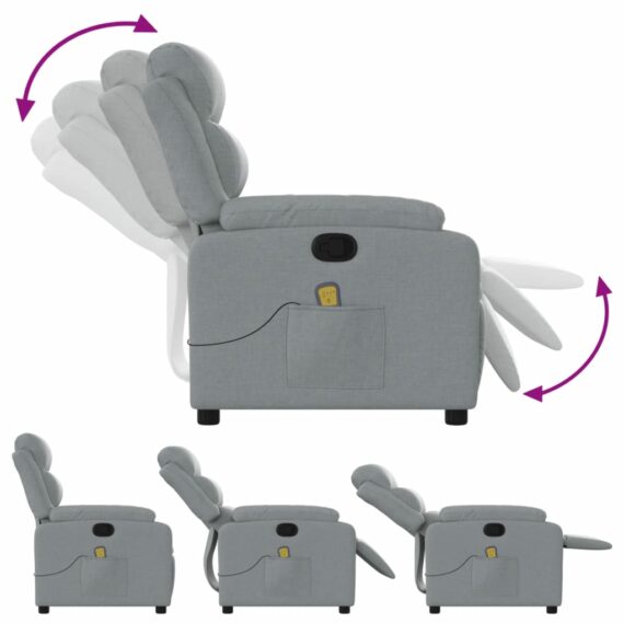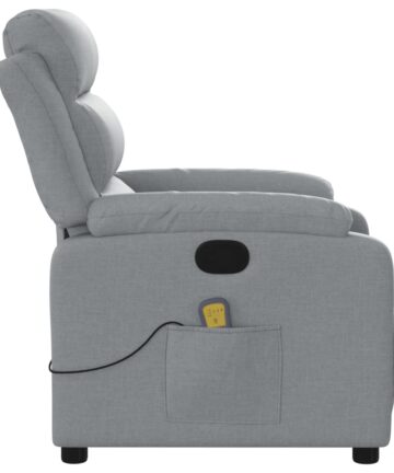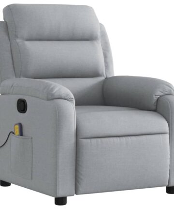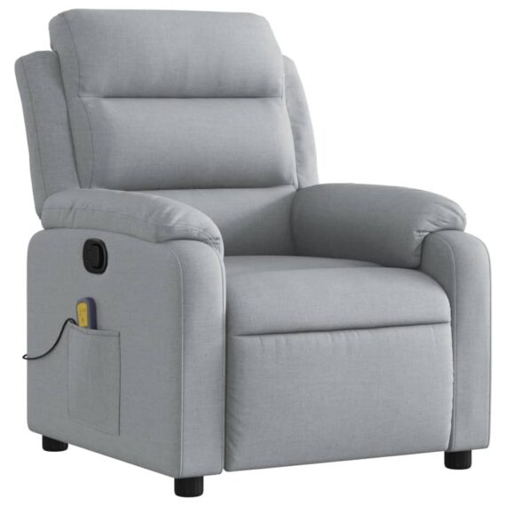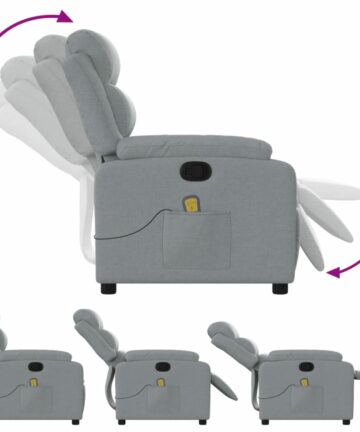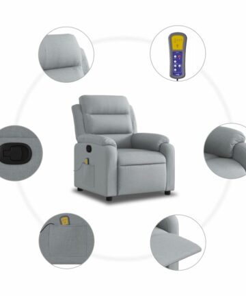 Lehnen Sie sich zurück und entspannen Sie sich in diesem äußerst bequemen Massagesessel! Manuelle Liegefunktion: Dieser Liegesessel verfügt über einen Griff auf der rechten Seite. Sie können die Fußstütze und die Rückenlehne durch einfaches Ziehen am Griff manuell in jede für Sie bequeme Position bringen. Diese Funktion ermöglicht eine maximale Neigung von 135 Grad. Zusätzlich lässt sich die Rückenlehne durch einfaches Ziehen am Griff schnell in die Ausgangsposition zurückstellen. Vibrationsfunktion: Die 6 Massagepunkte ermöglichen eine gezieltere Massage. Mit der mitgelieferten Handsteuerung können Sie verschiedene Massageprogramme auswählen. Die Massagefunktion wird über den USB-Anschluss mit Strom versorgt, ein zertifiziertes 5-V-USB-Netzteil ist jedoch nicht im Lieferumfang enthalten. Bequemes Sitzerlebnis: Die dick gepolsterte Sitzfläche, Rückenlehne und die breiten, mit Stoff bezogenen Armlehnen sorgen für ein behagliches und warmes Gefühl, während Sie sitzen. Der Stoff besticht durch seine schlichte und klare Optik und ist atmungsaktiv und strapazierfähig.Praktische Seitentasche: Dieser Sessel verfügt über eine Seitentasche für Ihre Fernbedienung oder um wichtige Gegenstände griffbereit aufzubewahren.Solider und stabiler Rahmen: Der Rahmen aus Holz und Metall sorgt für eine starke Struktur und Stabilität. Dieser Relaxsessel ist bequem und langlebig.
