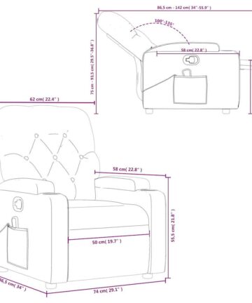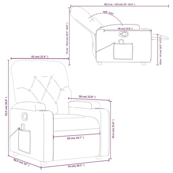 Lehnen Sie sich zurück und entspannen Sie sich in diesem äußerst bequemen Massagesessel! Manuelle Liegefunktion: Dieser Liegesessel verfügt über einen Griff auf der rechten Seite. Sie können die Fußstütze und die Rückenlehne durch einfaches Ziehen am Griff manuell in jede gewünschte Position bringen. Diese Funktion ermöglicht eine maximale Neigung von 135 Grad. Zusätzlich lässt sich die Rückenlehne durch einfaches Ziehen am Griff schnell in die Ausgangsposition zurückstellen. Vibrationsfunktion: Die 6 Massagepunkte ermöglichen eine gezieltere Massage. Mit der mitgelieferten Handsteuerung können Sie verschiedene Massageprogramme auswählen. Die Massagefunktion wird über den USB-Anschluss mit Strom versorgt, ein zertifiziertes 5-V-USB-Netzteil ist jedoch nicht im Lieferumfang enthalten. Bequemes Sitzerlebnis: Die dick gepolsterte Sitzfläche, Rückenlehne und die breiten Armlehnen mit Kunstlederbezug sorgen für ein behagliches Gefühl und geben Ihnen das Gefühl, beim Sitzen umarmt zu sein. Kunstleder ist ein äußerst strapazierfähiges Material. Er ist schmutzabweisend und lässt sich daher leicht mit einem feuchten Tuch reinigen. Die glatte Oberfläche verleiht zudem ein luxuriöses Aussehen und die Schönheit von echtem Leder.Praktische Getränkehalter und Seitentasche: Dieser Sessel verfügt über zwei praktische Getränkehalter für Ihre Getränke und eine Seitentasche für Ihre Fernbedienung oder wichtige Gegenstände in Reichweite.Solider und stabiler Rahmen: Der Rahmen aus Holz und Metall sorgt für eine starke Struktur und Stabilität. Dieser Liegesessel ist bequem und langlebig.