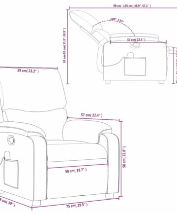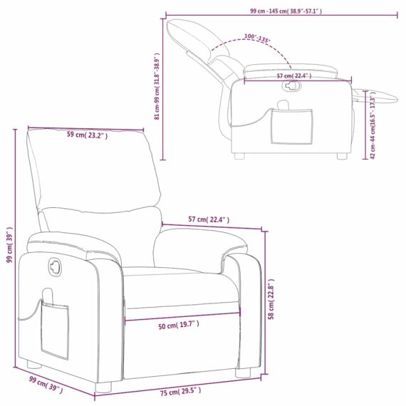 Lehnen Sie sich zurück und entspannen Sie sich in diesem äußerst bequemen Massagesessel! Manuelle Liegefunktion: Dieser Liegesessel verfügt über einen Griff auf der rechten Seite. Sie können die Fußstütze und die Rückenlehne durch einfaches Ziehen am Griff manuell in jede gewünschte Position bringen. Diese Funktion ermöglicht eine maximale Neigung von 135 Grad. Zusätzlich lässt sich die Rückenlehne durch einfaches Ziehen am Griff schnell in die Ausgangsposition zurückstellen. Vibrationsfunktion: Die 6 Massagepunkte ermöglichen eine gezieltere Massage. Mit der mitgelieferten Handsteuerung können Sie verschiedene Massageprogramme auswählen. Die Massagefunktion wird über den USB-Anschluss mit Strom versorgt, ein zertifiziertes 5-V-USB-Netzteil ist jedoch nicht im Lieferumfang enthalten. Bequemes Sitzerlebnis: Die dick gepolsterte Sitzfläche, Rückenlehne und die breiten Armlehnen mit Kunstlederbezug sorgen für ein behagliches Gefühl und geben Ihnen das Gefühl, beim Sitzen umarmt zu sein. Kunstleder ist ein äußerst strapazierfähiges Material. Er ist schmutzabweisend und lässt sich daher leicht mit einem feuchten Tuch reinigen. Die glatte Oberfläche verleiht ihm zudem ein luxuriöses Aussehen und die Schönheit von echtem Leder.Praktische Seitentasche: Dieser Sessel verfügt über eine Seitentasche für Ihre Fernbedienung oder um wichtige Gegenstände griffbereit aufzubewahren.Solider und stabiler Rahmen: Der Rahmen aus Holz und Metall sorgt für eine starke Struktur und Stabilität. Dieser Relaxsessel ist bequem und langlebig.