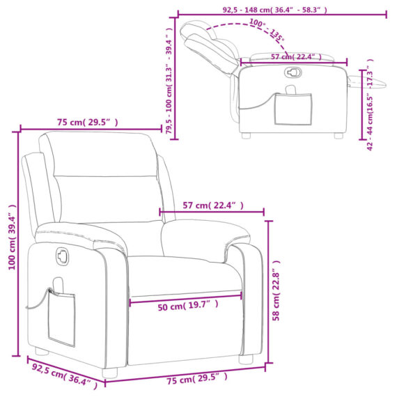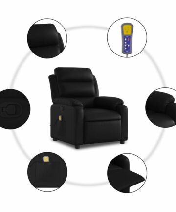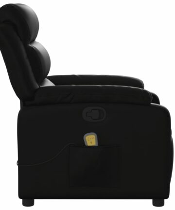 Lehnen Sie sich zurück und entspannen Sie sich in diesem äußerst bequemen Massagesessel! Manuelle Liegefunktion: Dieser Liegesessel verfügt über einen Griff auf der rechten Seite. Sie können die Fußstütze und die Rückenlehne durch einfaches Ziehen am Griff manuell in jede gewünschte Position bringen. Diese Funktion ermöglicht eine maximale Neigung von 135 Grad. Zusätzlich lässt sich die Rückenlehne durch einfaches Ziehen am Griff schnell in die Ausgangsposition zurückstellen. Vibrationsfunktion: Die 6 Massagepunkte ermöglichen eine gezieltere Massage. Mit der mitgelieferten Handsteuerung können Sie verschiedene Massageprogramme auswählen. Die Massagefunktion wird über den USB-Anschluss mit Strom versorgt, ein zertifiziertes 5-V-USB-Netzteil ist jedoch nicht im Lieferumfang enthalten. Bequemes Sitzerlebnis: Die dick gepolsterte Sitzfläche, Rückenlehne und die breiten Armlehnen mit Kunstlederbezug sorgen für ein behagliches Gefühl und geben Ihnen das Gefühl, beim Sitzen umarmt zu sein. Kunstleder ist ein äußerst strapazierfähiges Material. Er ist schmutzabweisend und lässt sich daher leicht mit einem feuchten Tuch reinigen. Die glatte Oberfläche verleiht ihm zudem ein luxuriöses Aussehen und die Schönheit von echtem Leder.Praktische Seitentasche: Dieser Sessel verfügt über eine Seitentasche für Ihre Fernbedienung oder um wichtige Gegenstände griffbereit aufzubewahren.Solider und stabiler Rahmen: Der Rahmen aus Holz und Metall sorgt für eine starke Struktur und Stabilität. Dieser Relaxsessel ist bequem und langlebig.