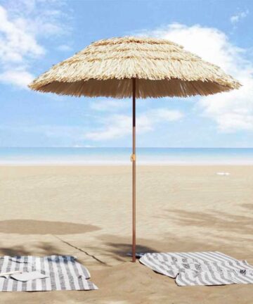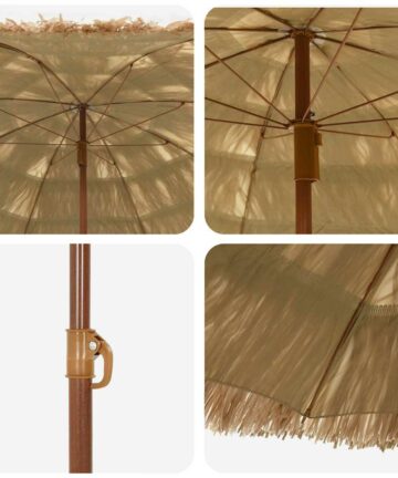 Der braune Strandschirm ist eine tolle Mischung aus funktionalem Design und tropischem Stil und bringt einen lebhaften Akzent in deine Outdoor-Umgebung. Perfekt für die Sommermonate, schützt dich dieser Schirm vor grellem Sonnenlicht und überraschendem Regen und schafft eine entspannende und angenehme Atmosphäre zum Faulenzen oder Feiern im Garten oder auf der Terrasse. Materialien: Hergestellt mit einem stabilen Stahlrahmen, bietet dieser Strandschirm unerreichte Stabilität und Widerstandsfähigkeit. Das Polyester-Dach ist sowohl UV-beständig als auch wasserabweisend und wurde entwickelt, um sonnige und regnerische Wetterbedingungen standzuhalten, was ihn zu einem ganzjährigen Essential für Outdoor-Freizeitbereiche macht. Enthaltene Komponenten: Mit einem großzügigen runden Dach ausgestattet, bietet dieser Schirm ausreichend Beschattungsfläche. Die strukturierte Oberfläche verleiht eine stilvolle Ästhetik, die jede Strandliege oder Outdoor-Anordnung ergänzt. Seine robuste Konstruktion sorgt für dauerhafte Haltbarkeit und ansprechende Funktionalität. Funktionen / Nutzung / Design: Entworfen mit UV-Schutz und wasserfesten Materialien, verspricht dieser Schirm hervorragende Leistung unter der Sonne oder bei leichten Schauern. Sein tropisch inspiriertes Design verbessert jede Outdoor-Ästhetik und bringt ein exotisches Element in Garten oder Terrasse. Empfohlene Anwendungen: Idealerweise geeignet für Gärten, Patios oder Strandgelegenheiten bietet der Strandschirm vielseitige Beschattungslösungen für verschiedene Outdoor-Versammlungen. Ob du ein sonnenverwöhntes Brunch veranstaltest oder einen Zufluchtsort vor der Nachmittagshitze suchst, dieser Schirm ist die perfekte Wahl. Pflege & Wartung: Um die Langlebigkeit zu gewährleisten, stelle diesen Schirm außerhalb der direkten Sonneneinstrahlung auf, wenn du ihn nicht nutzt. Verwende eine Schutzhülle bei widrigen Wetterbedingungen, um sein Aussehen und seine Funktionalität zu bewahren und wiederholte saisonale Freude zu garantieren.