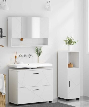 Dieses Badezimmermöbel-Set aus Holzwerkstoff bringt frischen Wind in dein Badezimmer. Es ist ideal, wenn du nach einem cleanen, ordentlichen Look suchst, da die neutralen Farben und glatten Oberflächen super in jedes moderne Badezimmerdesign passen. Du bekommst wichtige Teile wie einen Waschbeckenunterschrank und einen Spiegelschrank, plus jede Menge Stauraum, um deine Toilettenartikel und andere Sachen zu organisieren. Materialien: Hergestellt aus Holzwerkstoff, bringt dieses Badezimmer-Set eine schöne, glatte Oberfläche, die nicht nur gut aussieht, sondern auch praktisch ist. Dank der fleckenbeständigen Eigenschaften ist die Reinigung einfach, und so bleibt es über die Zeit schick – ideal für vielbeschäftigte Badezimmer. Enthaltene Komponenten: Das Set besteht aus einem Waschbeckenunterschrank, einem Spiegelschrank und einem zusätzlichen Schrank. Diese Teile bieten dir viele Stauraummöglichkeiten und sind funktional für die persönliche Pflege und Dekoration. Eigenschaften / Funktion / Design: Mit viel Stauraum gibt’s genügend Fächer und Regale, die dir helfen, all deine Badezimmerutensilien ordentlich zu halten, sodass du alles schnell findest. Empfohlene Verwendung: Dieses Set passt bestens in Badezimmer jeder Größe und bietet clevere Stauraumlösungen, vor allem in engen Bereichen. Die wandmontierte Ausführung schafft mehr Platz auf dem Boden, sodass alles größer und geräumiger wirkt. Pflege & Wartung: Wisch dein Badezimmer-Set einfach hin und wieder mit einem feuchten Tuch ab, um es toll aussehen zu lassen. Diese einfache Routine sorgt dafür, dass es gut aussieht und lange hält.