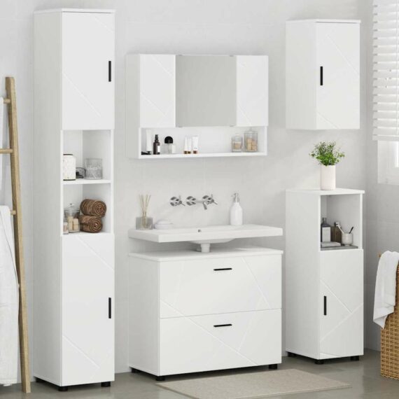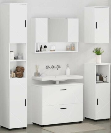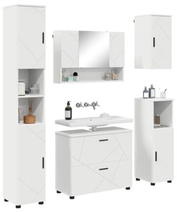 Dieses Badezimmermöbelset aus Holzwerkstoff bringt einen smarten, modernen Look, der jedes Bad aufpeppt. Es wurde so gestaltet, dass es für alle passt und verbindet schickes Design mit Funktionalität. Die glatte, matte Oberfläche verleiht Eleganz, ohne übertrieben zu wirken, und passt super in minimalistische oder aufwändige Dekorationsstile. Glattes Material: Der Holzwerkstoff sorgt für eine elegante, gleichmäßige Oberfläche, die langlebig ist. Es sieht nicht nur gut aus, sondern fühlt sich auch toll an und ist eine super Wahl für schicke Badezimmer. Und die Reinigung ist mit dieser glatten Oberfläche ein Kinderspiel. Moderne Ausstrahlung: Mit klaren Linien und einfachem Design passt dieses Möbelset perfekt in jedes moderne Zuhause. Die neutralen Farben machen es vielseitig und harmonieren gut mit deinen Badezimmerarmaturen, während der Mix aus Stil und Funktion die Stimmung im Raum hebt. Funktionale Stauraum-Module: Das Set umfasst einen Waschbeckenunterschrank, einen Spiegelschrank und drei weitere Schränke, die cleveren Stauraum bieten. Jedes Stück nutzt den Platz optimal mit praktischen Features wie Regalen, Türen und Schubladen, alles aus robustem Holzwerkstoff für eine lange Lebensdauer. Nutzerfreundliches Design: Hier dreht sich alles um Praktikabilität, mit Stangengriffen und Pfostenbeinen, die die Benutzung einfacher machen. Das wandmontierte Design spart Platz auf dem Boden und lässt auch kleine Badezimmer größer und einladender wirken. Minimale Pflege: Dank der fleckenbeständigen Oberflächen ist es echt einfach, dieses Set sauber zu halten. Ein schneller Wisch mit einem feuchten Tuch reicht aus, um es ohne viel Aufwand toll aussehen zu lassen. Diese feine Materialwahl sorgt dafür, dass du mit einfacher Pflege und einem schicken Look, der lange besteht, belohnt wirst.