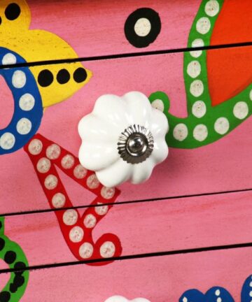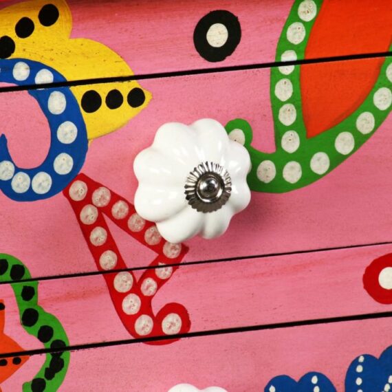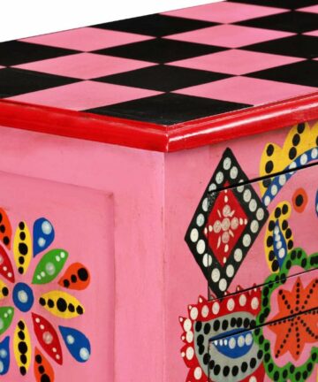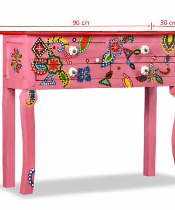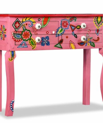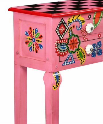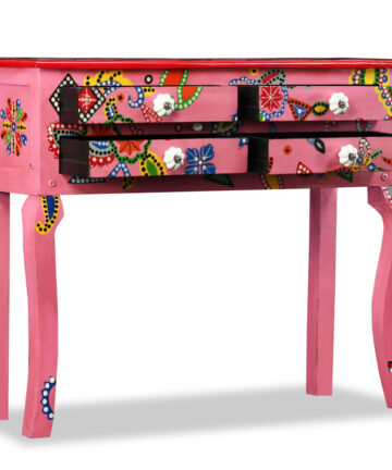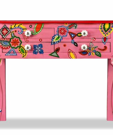 Dieser einzigartige Konsolentisch aus Holz verleiht deinem Wohn- oder Schlafzimmer eine farbenfrohe Note und ist überall ein echter Hingucker. Mit seinem markanten Design zieht dieser handbemalte Konsolentisch die Aufmerksamkeit deiner Gäste sofort auf sich. Dieser handgefertigte Tisch aus Mangoholz ist sowohl robust als auch schön anzusehen, die hochwertige Verarbeitung trägt zu seinem Vintage-Look bei. Der Tisch verfügt über reichhaltige, handbemalte dekorative Details – das macht ihn zum perfekten Möbelstück für Trendbewusste und Individualisten! Die markanten Griffe erleichtern das Öffnen der Schubladen und unterstreichen den einzigartigen Look dieses Konsolentisches. Der Konsolentisch verfügt über 4 Schubladen und bietet dadurch reichlich Platz, um verschiedene Sachen ordentlich aufzubewahren. Die farbenfrohe Tischplatte eignet sich ideal, um Dekoartikel wie Vasen, Bilderrahmen, Obstkörbe usw. zur Schau zu stellen. Der Zusammenbau ist kinderleicht.