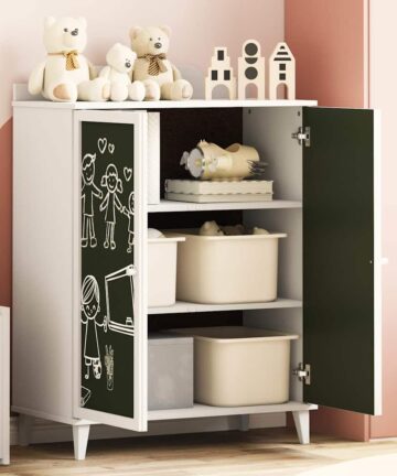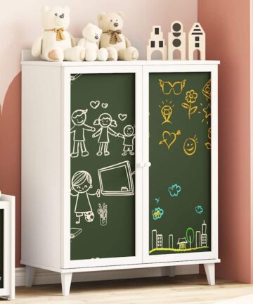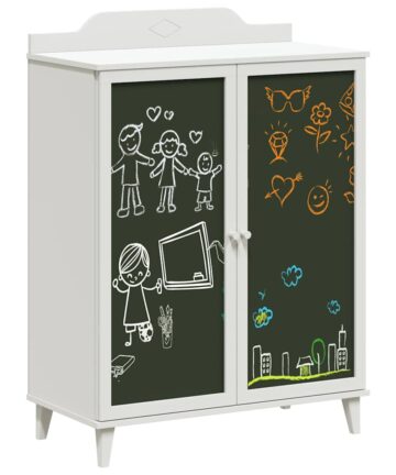Schau dir diesen tollen Kreidetafel-Schrank an! Er bringt moderne Einfachheit mit einer Portion Kreativität. Mit seiner Kreidetafeloberfläche ist er die perfekte Leinwand für deinen persönlichen Akzent, während er gleichzeitig viel Stauraum bietet. Hergestellt aus hochwertigem Holzwerkstoff und gut verarbeitet, fügt er sich nahtlos in trendige Wohnzimmer ein und wird zum echten Hingucker. Er ist optimal für alle, die sowohl auf Aussehen als auch auf Funktionalität Wert legen, passt gut in verschiedene Räume und bietet eine solide Lösung, um deine Sachen unterzubringen. Bau aus Holzwerkstoff Hergestellt aus robustem Holzwerkstoff für langlebige Nutzung. Seine glatte Oberfläche sieht toll aus und passt super in jedes Wohnzimmer. Kreidetafeloberfläche Die coole Kreidetafeloberfläche macht diesen Schrank zu einem lustigen und interaktiven Möbelstück. Perfekt, um Notizen zu machen, zu kritzeln oder Zitate zu teilen, ist er ein Muss, das jeden einbindet. Reichlich Stauraum Öffne die stylischen Türen und finde praktische Regale, die perfekt für Kleidung, Accessoires und mehr geeignet sind. Ihr simples Design gibt dir viel Platz, um deine Sachen ordentlich und griffbereit zu halten. Elegante Scharniertüren Der Schrank hat Scharniertüren aus Holzwerkstoff, die schick und funktional sind. Die weißen Knöpfe setzen einen subtilen, aber eleganten Akzent, der gut zur Gesamtstimmung passt. Einfache Pflege Um das Aussehen zu erhalten, reicht es, einfach mit einem feuchten Tuch drüber zu wischen. Er ist so designed, dass er leicht zu pflegen ist, sodass du dich auf die Nutzung konzentrieren kannst, anstatt dich darum zu sorgen. Die Montage ist super einfach und benötigt nur eine Handvoll Werkzeuge für einen schnellen Aufbau.