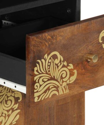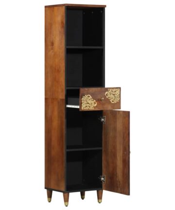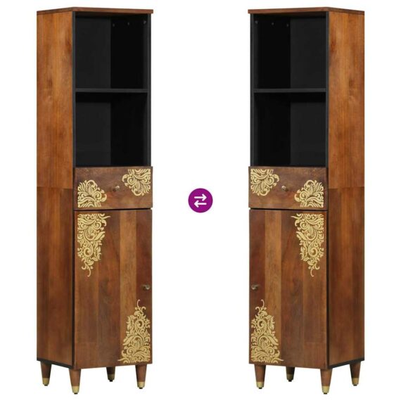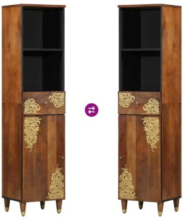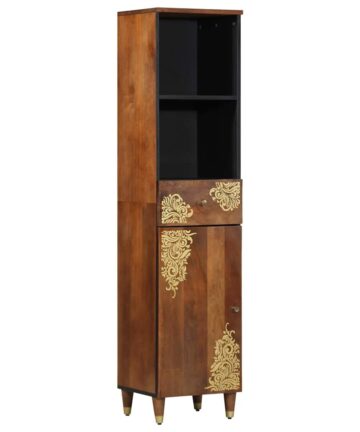 Schau dir dieses moderne Badezimmer-Sideboard an, das minimalistische Eleganz ausstrahlt und perfekt für Innenräume ist. Es bietet sowohl Stauraum als auch Stil. Hergestellt für die heutigen Wohnräume, fügt sich dieses Stück perfekt in dein Wohnzimmer ein und ist eine top Aufbewahrungslösung. Mit seiner glatten rechteckigen Form passt es gut in die Umgebung und wird sicher die Aufmerksamkeit deiner Gäste auf sich ziehen. Materialien: Der Sideboard besteht aus solidem Mangoholz, bekannt für seine schöne Textur und Haltbarkeit. Sein klassischer Charme macht ihn zu einem Teil deiner Wohnkultur, während sich alles verändert. Enthaltene Komponenten: Er hat bündige Türen, die super einfach zu bedienen sind und schick aussehen. Die goldenen Knäufe an den Griffen verleihen ihm eine stilvolle Note, die das Öffnen einfach macht. Merkmale / Funktion / Design: Diese Einheit hat jede Menge Stauraum. Mit Schubladen und Fächern ist sie ideal zur Organisation deiner Essentials, und die rechteckige Form passt perfekt in Ecken oder steht stolz für sich allein. Empfohlene Verwendungen: Mit cleverem Stauraum und tollem Aussehen kann dieser Sideboard ein normales Wohnzimmer in einen eleganten Raum verwandeln. Nutze ihn, um Familientreasuren, Bettwäsche oder Deko zu verstauen und bring Stil und Praktikabilität in einem schönen Paket. Pflege & Wartung: Um ihn schön zu halten, einfach regelmäßig mit einem weichen Tuch abstauben und raue Chemikalien vermeiden, die das glänzende Finish des Holzes beeinträchtigen könnten.