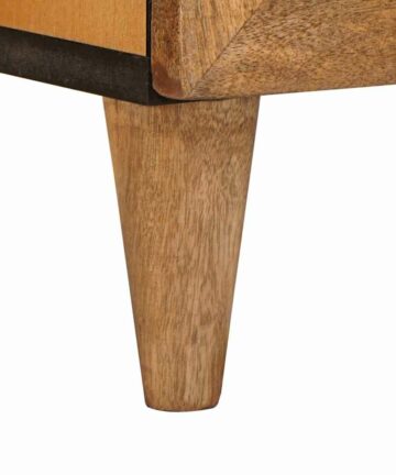 Dieser TV-Schrank kombiniert super Funktionalität mit modernem Flair – perfekt für jedes Wohnzimmer. Das niedrige Design bietet einen stylischen Platz für dein Entertainment-Setup oder coole Deko. Mit einer warmen Textur und stabiler Bauweise hebt er das schöne Mango-Holz richtig hervor. Wenn du einen Platz suchst, um deine Medien ordentlich aufzubewahren und dabei gut auszusehen, passt dieses Teil perfekt zu modernen Vibes. Massivholz-Mango-Bauweise : Aus massivem Mango-Holz ist dieser Schrank stabil und stark. Die coole Holzmaserung trägt zu seinem Charm bei und schafft eine umweltfreundliche Atmosphäre in deinem Wohnraum. Dieses Material vereint Stärke und Schönheit – eine top Wahl für modernes Wohnen. Praktisches Stauraumdesign : Er bietet echt viel Stauraum mit stabilen Regalen aus massivem Mango-Holz, die deine Medien mühelos halten. Die Tür mit Scharnier sorgt dafür, dass du alles leicht erreichst, während du es versteckst und deinen Raum ordentlich hältst. Schlanke, strukturierte Oberfläche : Das matte, strukturierte Finish am Rahmen und an den Griffen verleiht ihm einen eleganten Look. Dieser nicht reflektierende Stil sorgt für einen raffinierten Touch, und die strukturierte Oberfläche fühlt sich gut an. Das ist eine clevere Designwahl für Häuser, in denen Stil und Praktikabilität Hand in Hand gehen. Klassisches Styling mit konisch zulaufenden Beinen : Mit eleganten, konisch zulaufenden Beinen aus massivem Mango-Holz erhält der Schrank Stabilität und erinnert an das Design aus der Mitte des Jahrhunderts. Das macht ihn vielseitig und perfekt für alle Arten von Interieurs, von minimalistisch bis eklektisch. Pflegehinweise : Um ihn gut aussehen zu lassen, wisch einfach zwischendurch mit einem trockenen Tuch drüber. Vermeide scharfe Chemikalien, um das Holz zu schonen. Ein bisschen regelmäßige Pflege sorgt dafür, dass der Schrank über Jahre hinweg ein schickes Teil in deinem Zuhause bleibt.