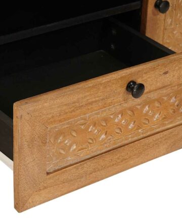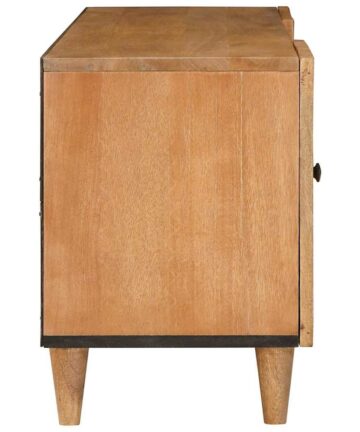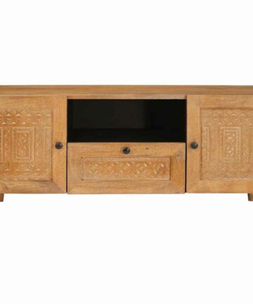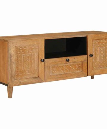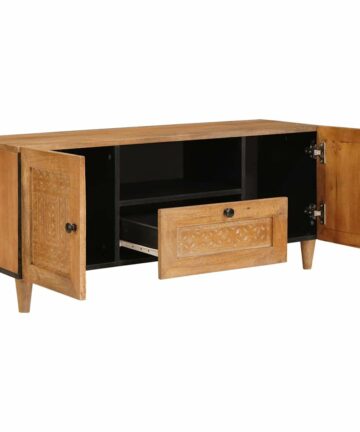 Dieser TV-Schrank aus massivem Mango-Holz kombiniert modernen Stil und Praktikabilität perfekt und ist ideal, um deinem Wohnzimmer einen frischen Look zu verleihen. Mit viel Liebe gemacht, hat der Schrank eine rechteckige Form, klare Linien und eine strukturierte Oberfläche, die nicht nur gut aussieht, sondern auch gut funktioniert. Die natürlichen Holzfarben und die schwarzen Details schaffen eine warme Atmosphäre, die zu verschiedenen Dekoren passt. Eine ideale Wahl für alle, die ihr Zuhause etwas aufpeppen möchten. Massives Mango-Holz: Dieser Schrank besteht komplett aus massivem Mango-Holz, ist also stabil und langlebig. Die natürliche Maserung sorgt für eine schöne Wärme und Charme, wodurch er ein echter Blickfang in jedem Wohnzimmer ist. Vielseitige Stauraummöglichkeiten: Mit Regalen und Schubläden hast du genügend Platz für deine Medien, Bücher und mehr, sodass alles schön ordentlich bleibt. Stylische Türen mit Scharnieren: Die Türen mit Scharnieren machen es leicht, zu erreichen, was du brauchst, und sehen dabei auch noch schick aus. Die matte Oberfläche der Griffe verleiht ihm einen modernen Touch. Strukturierte Oberfläche: Die einzigartige strukturierte Oberfläche gibt dem Schrank ein angenehmes Gefühl und fügt etwas Charakter hinzu. Einfacher Zusammenbau: Du brauchst zwei Personen und einen Schraubendreher, um ihn zusammenzubauen. Die einfachen Anleitungen machen den Aufbau kinderleicht.