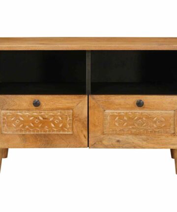 Das TV-Lowboard aus massivem Mangoholz verbindet modernen Charme mit praktischem Design. Es wurde entworfen, um jedes Wohnzimmer aufzuhellen und ist perfekt, um all deine Gadgets und Essentials an einem Platz zu verstauen. Die glatte Oberfläche strahlt modernen Vibe aus und passt gut zu verschiedenen Stilen, während es gleichzeitig praktisch für die Aufbewahrung ist. Massives Mangoholz: Dieses TV-Lowboard besteht aus starkem Mangoholz, das für seine schöne Maserung und Haltbarkeit bekannt ist. Es ist die perfekte Mischung aus Stil und Robustheit – ein zeitloses Stück für dein Zuhause. Regal-Design: Mit seinen offenen Regalen bietet dieses Möbelstück viel Platz für deine Mediengeräte. Es hält alles ordentlich, sodass du deine Elektronik, Bücher oder Deko-Schnickschnack gut verstauen kannst. Moderner Look: Die mattierten Knöpfe geben einen Hauch von Klasse und betonen den modernen Stil. Die rechteckige Form passt gut zu verschiedenen Innendesigns, egal ob urban oder minimalistisch. Praktischer Stauraum: Mit vielen Fächern, darunter praktische Schubladen mit Knöpfen, bietet dieses Lowboard jede Menge Platz für Haushaltsgegenstände. Es hält deinen Medienbereich ordentlich, was zu einem aufgeräumten Zimmer beiträgt. Einfache Pflege: Die Pflege dieses TV-Lowboards ist easy – einfach mit einem trockenen Tuch abwischen, damit es gut aussieht. Vermeide aggressive Chemikalien, damit es lange frisch bleibt und du Freude daran hast.